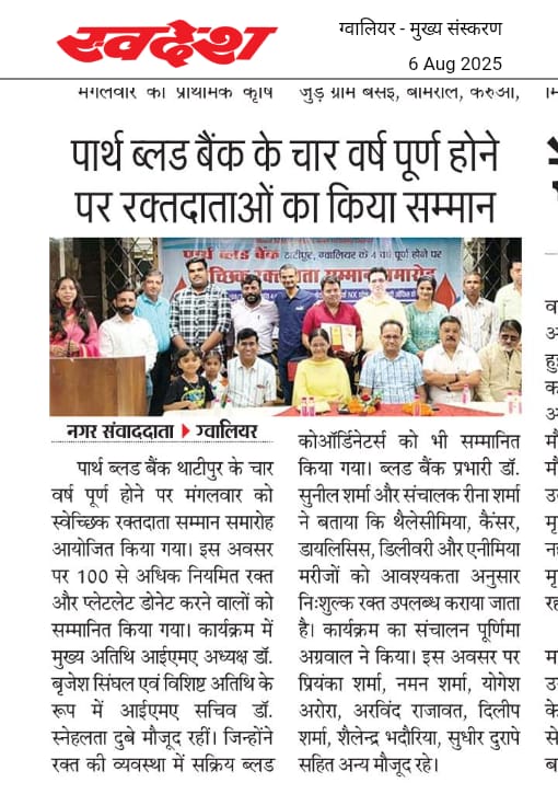 पार्थ ब्लड सेंटर के डॉक्टरों व पूरी टीम का हार्दिक धन्यवाद 🙏