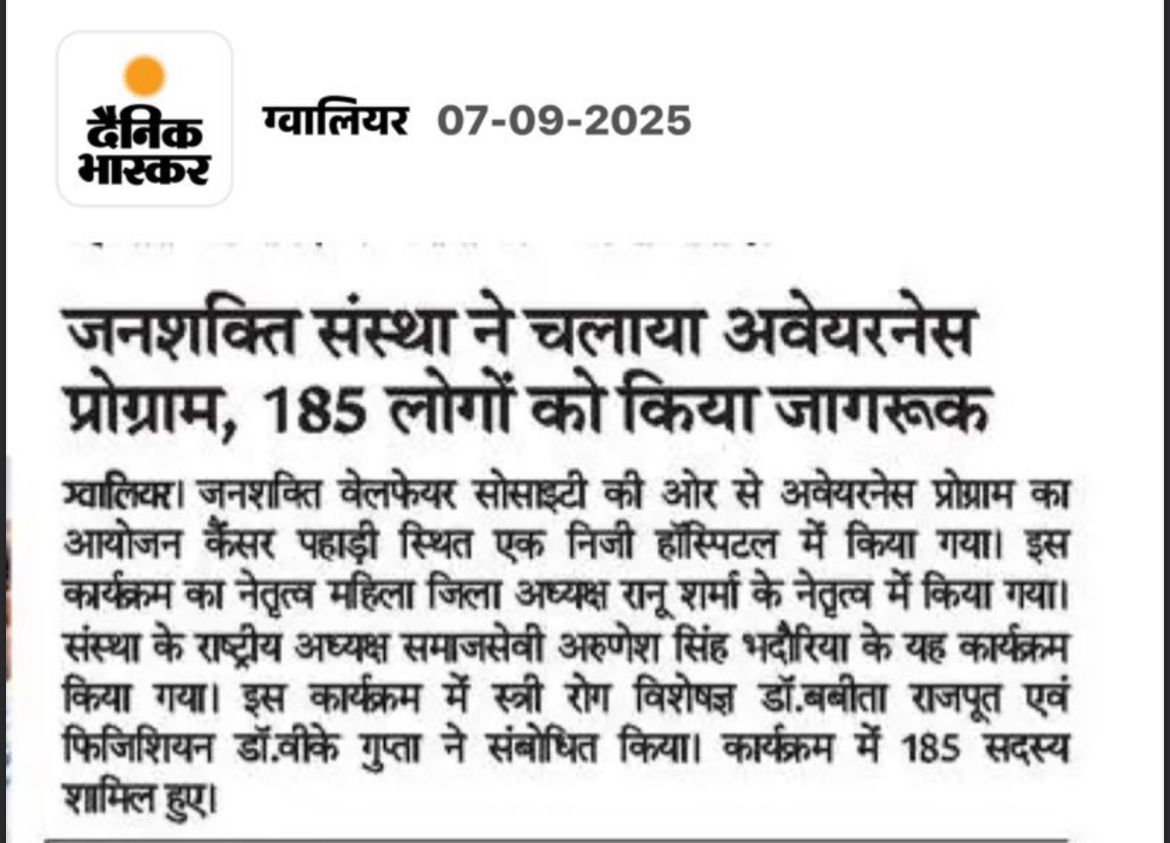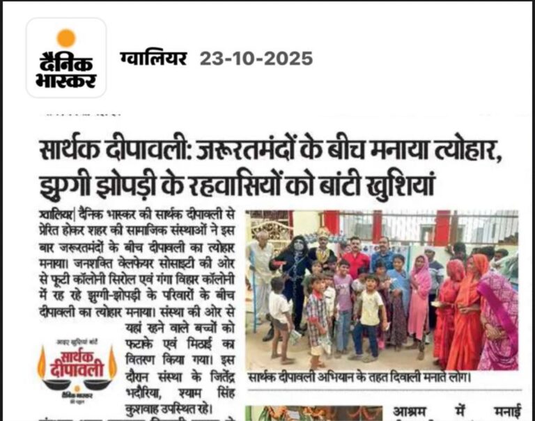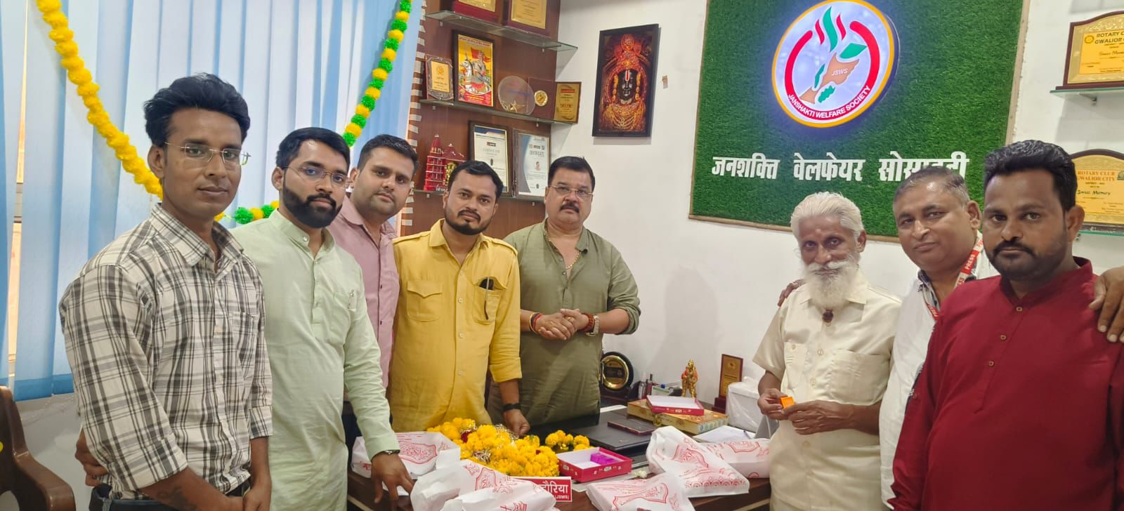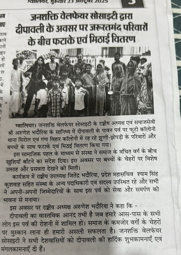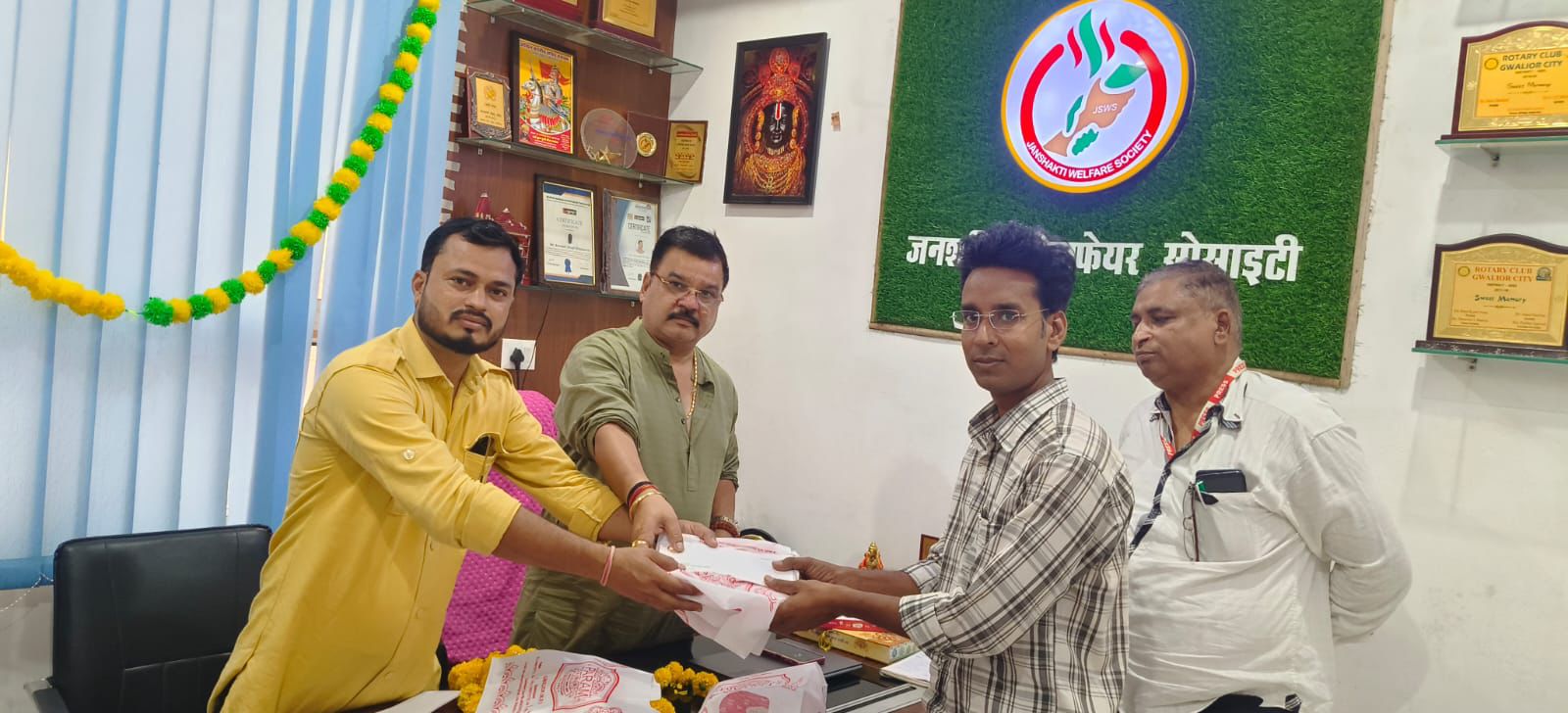 ग्वालियर (म.प्र.): दीपावली के पावन अवसर पर जनशक्ति वेलफेयर सोसायटी द्वारा ग्वालियर में पत्रकारों को मिठाई भेंट कर सम्मानित किया गया। यह कार्यक्रम संस्था के राष्ट्रीय अध्यक्ष एवं समाजसेवी श्री अरुणेश सिंह भदौरिया के नेतृत्व में आयोजित किया गया।