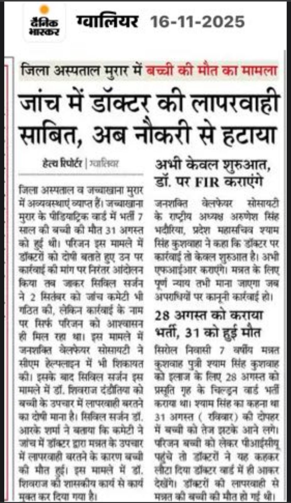 जनशक्ति की पहल से मिली राहत: 7 वर्षीय बच्ची की लापरवाही से हुई मौत पर डॉक्टर निलंबित