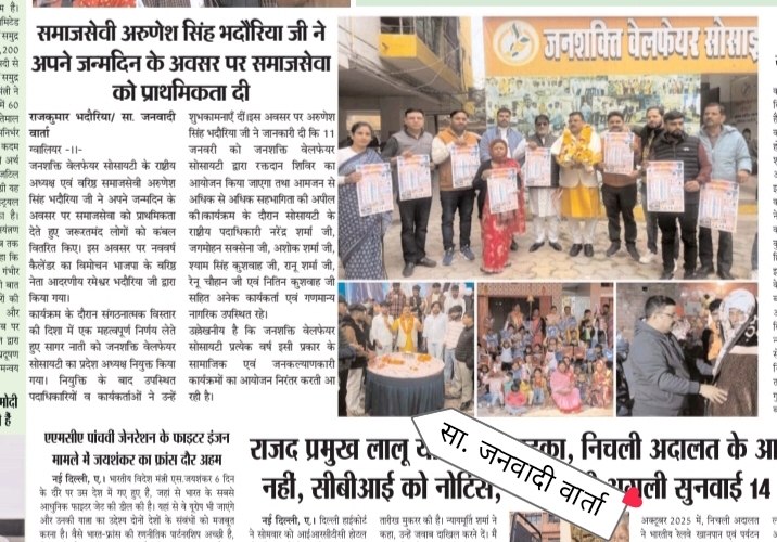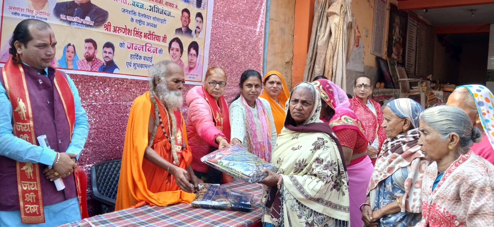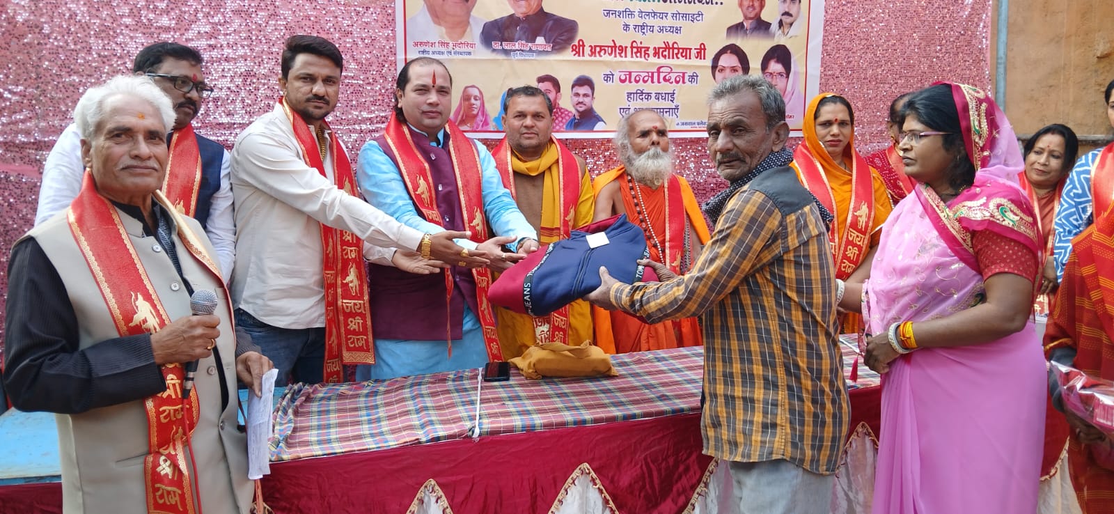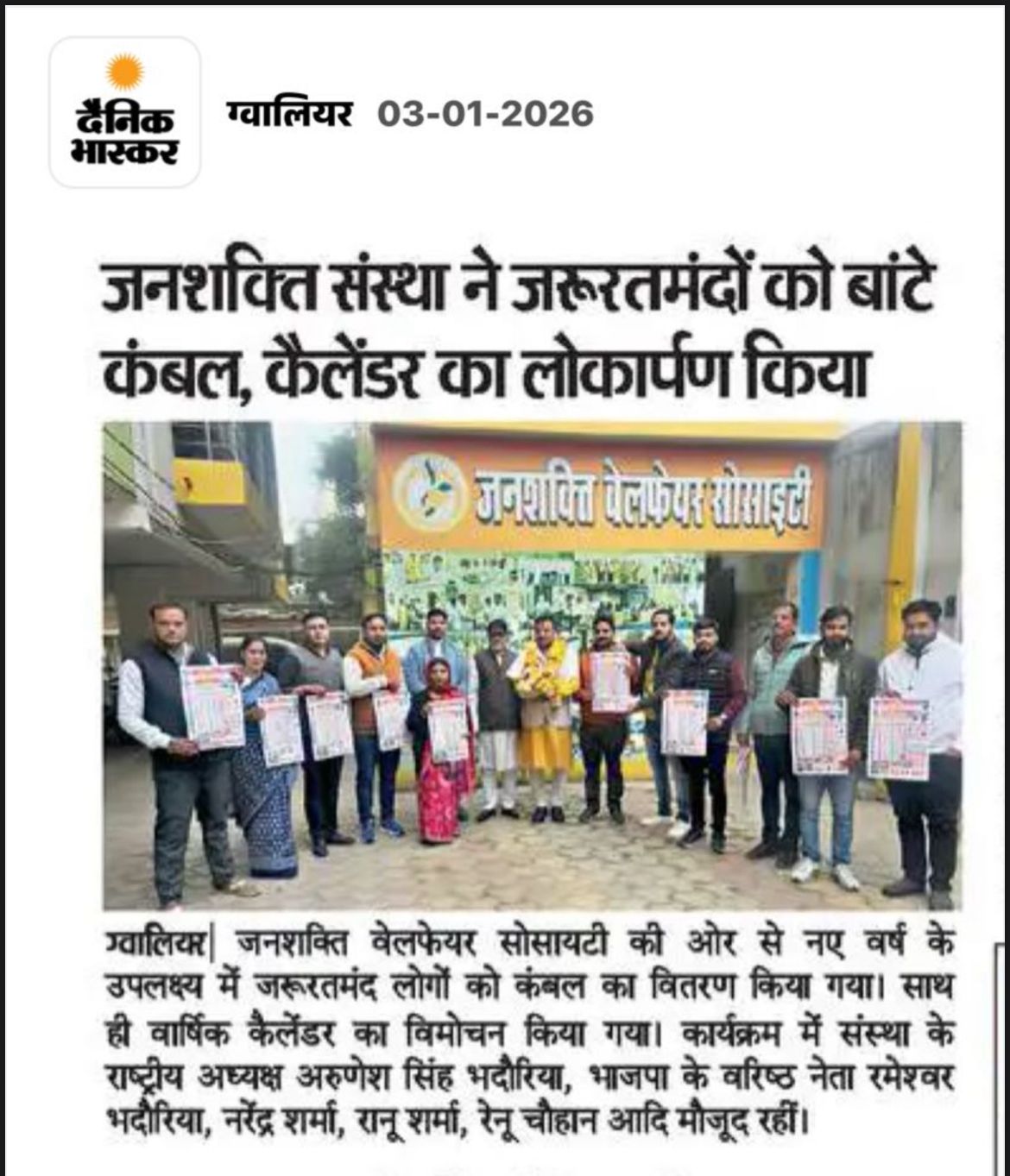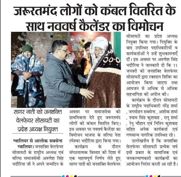 जनशक्ति वेलफेयर सोसायटी के राष्ट्रीय अध्यक्ष एवं वरिष्ठ समाजसेवी आदरणीय अरुणेश सिंह भदौरिया जी ने अपने जन्मदिन के अवसर पर समाजसेवा को प्राथमिकता देते हुए जरूरतमंद लोगों को कंबल वितरित किए। इस अवसर पर नववर्ष कैलेंडर का विमोचन भाजपा के वरिष्ठ नेता आदरणीय रमेश्वर भदौरिया जी द्वारा किया गया।